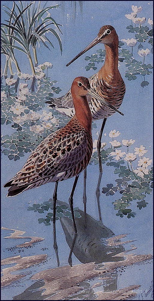 Ti offriamo una riproduzione artigianale su tela dell'opera famosa 'Nero coda Goodwits' di Charles Tunnicliffe, dal Museo delle Riproduzioni.
