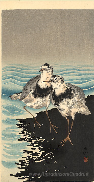 Ti offriamo una riproduzione artigianale su tela dell'opera famosa 'Nodi su Shore' di Ohara Koson, dal Museo delle Riproduzioni.