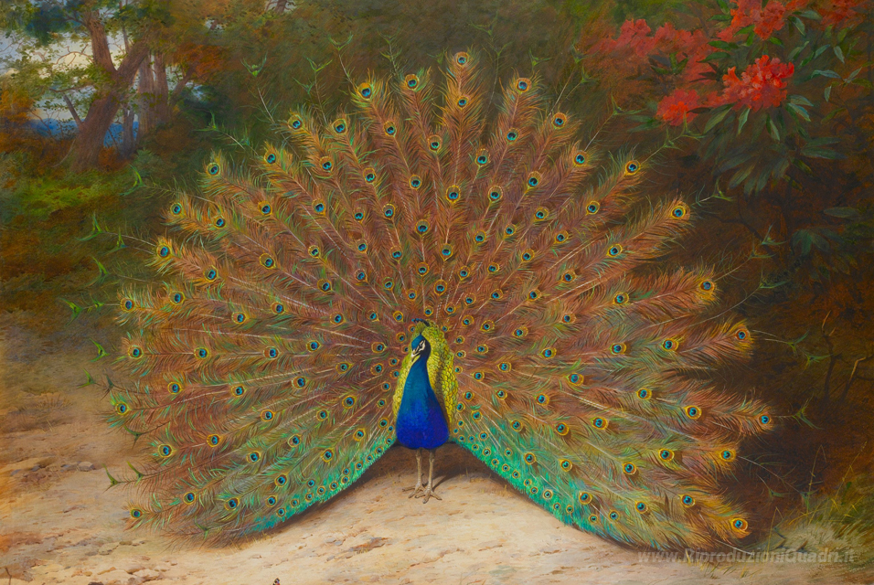 Scopri l’incanto del dipinto a olio Peacock e Peacock Butterfly realizzato dal maestro Archibald Thorburn, un’artista inglese noto per la sua straordinaria abilità nel catturare la bellezza della natura. Thorburn, attivo tra il XIX e il XX secolo, ha dedicato la sua carriera a rappresentare la fauna selvatica con un'attenzione meticolosa ai dettagli e una straordinaria sensibilità cromatica. Le sue opere sono celebri per il modo in cui riescono a trasmettere la vita e l'anima degli animali, rendendole uniche nel loro genere.