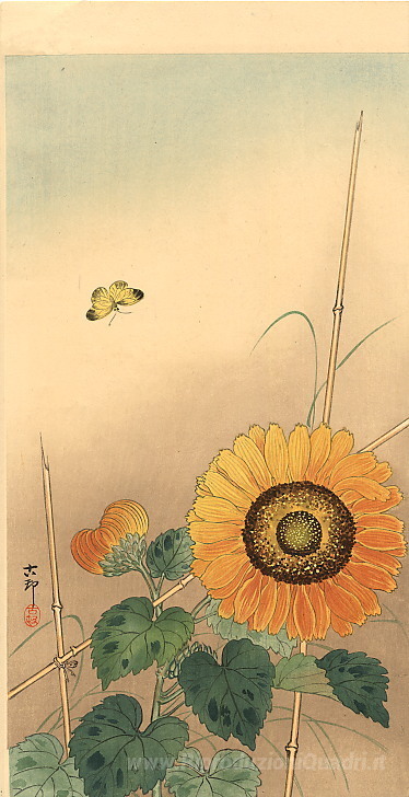 Ti offriamo una riproduzione artigianale su tela dell'opera famosa 'Piccola farfalla e girasole' di Ohara Koson, dal Museo delle Riproduzioni.