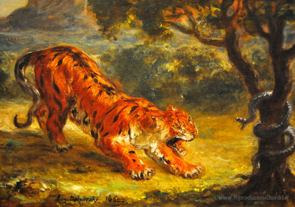 Ti offriamo una riproduzione artigianale su tela dell'opera famosa 'Tiger e Snake' di Eugene Delacroix, dal Museo delle Riproduzioni.
