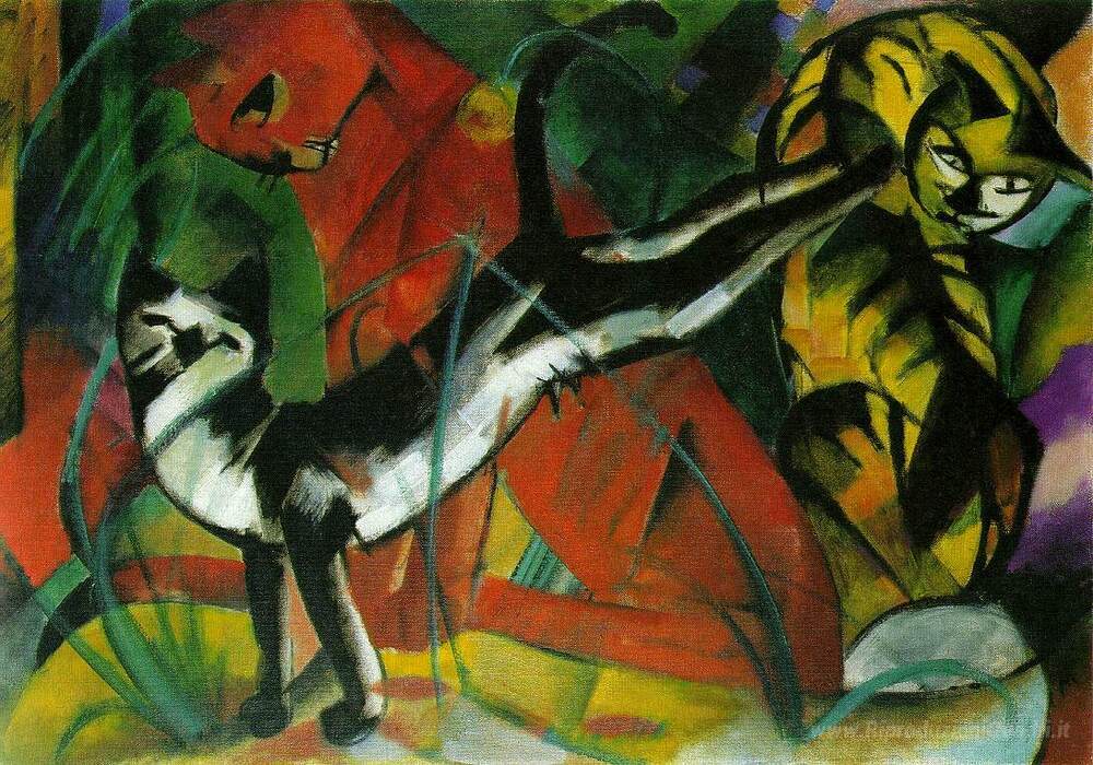 Benvenuti nel mondo affascinante dei dipinti a olio italiani, dove la tradizione artistica si fonde con l'innovazione e la passione. Tra le opere che arricchiscono la nostra collezione, spicca Tre gatti di Franz Marc, un capolavoro che cattura l’essenza della vita animale attraverso uno stile inconfondibile. Marc, pioniere della pittura moderna, utilizza colori vividi e forme stilizzate per evocare emozioni e dinamiche profonde, portando lo spettatore a riflettere sulla connessione tra l'uomo e la natura.