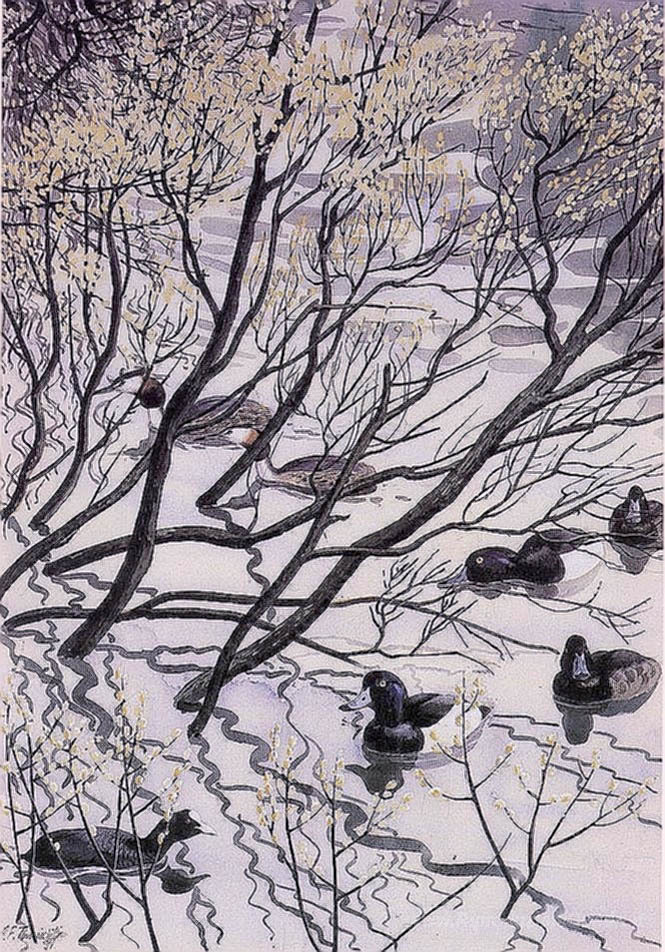 Ti offriamo una riproduzione artigianale su tela dell'opera famosa 'Uccelli acquatici' di Charles Tunnicliffe, dal Museo delle Riproduzioni.