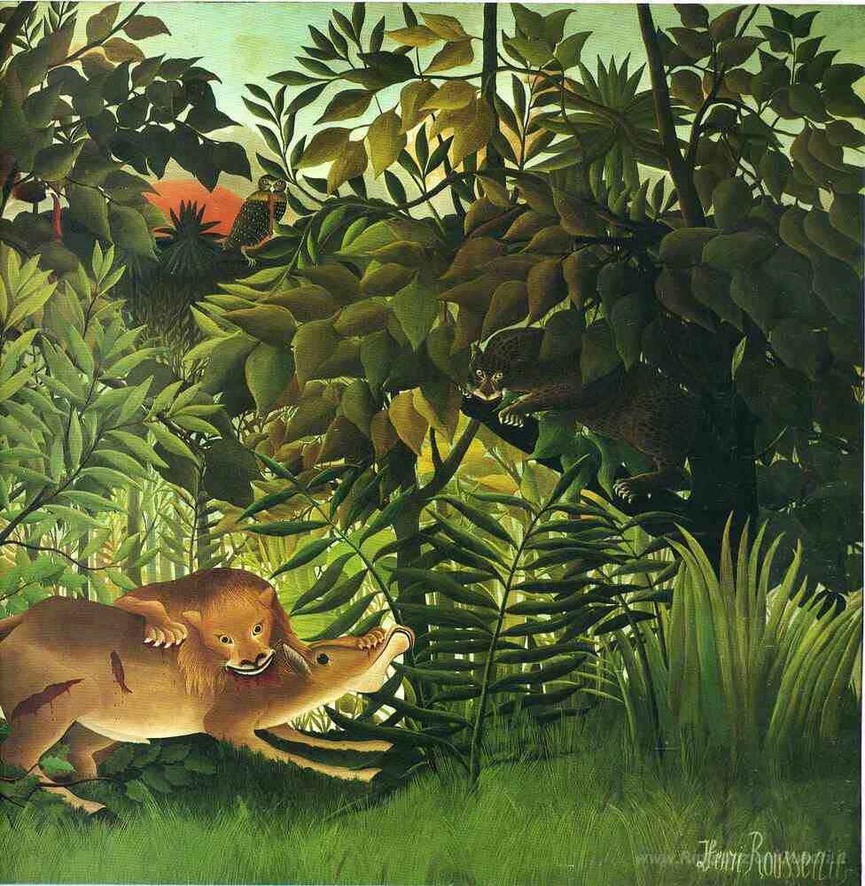 Ti offriamo una riproduzione artigianale su tela dell'opera famosa 'Un Leone che divora la sua preda' di Henri Rousseau, dal Museo delle Riproduzioni.