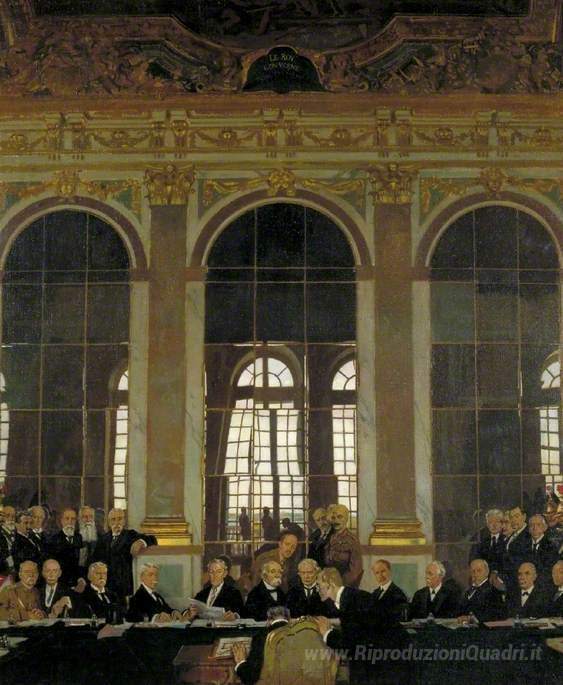 Ti offriamo una riproduzione artigianale su tela dell'opera famosa 'La firma della pace nella Sala degli Specchi, Versailles, 28 GIU' di William Orpen, dal Museo delle Riproduzioni.
