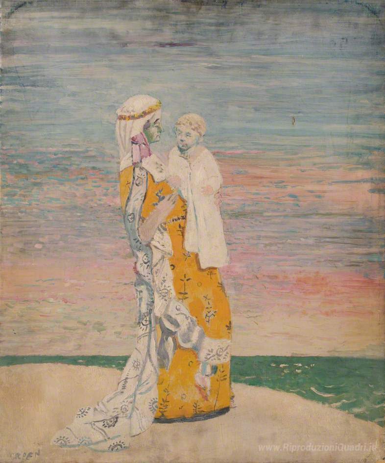 Ti offriamo una riproduzione artigianale su tela dell'opera famosa 'Madre e bambino sulla spiaggia' di William Orpen, dal Museo delle Riproduzioni.