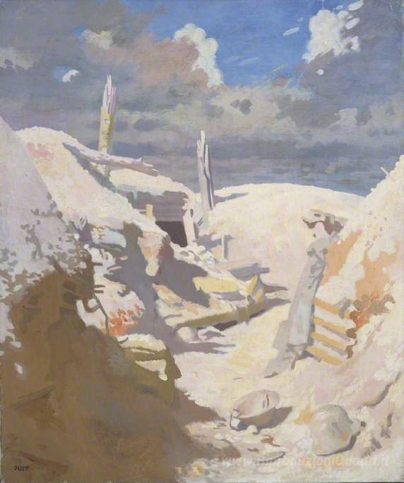 Ti offriamo una riproduzione artigianale su tela dell'opera famosa 'Shelter di un artigliere in una trincea, Thiepval 1917' di William Orpen, dal Museo delle Riproduzioni.