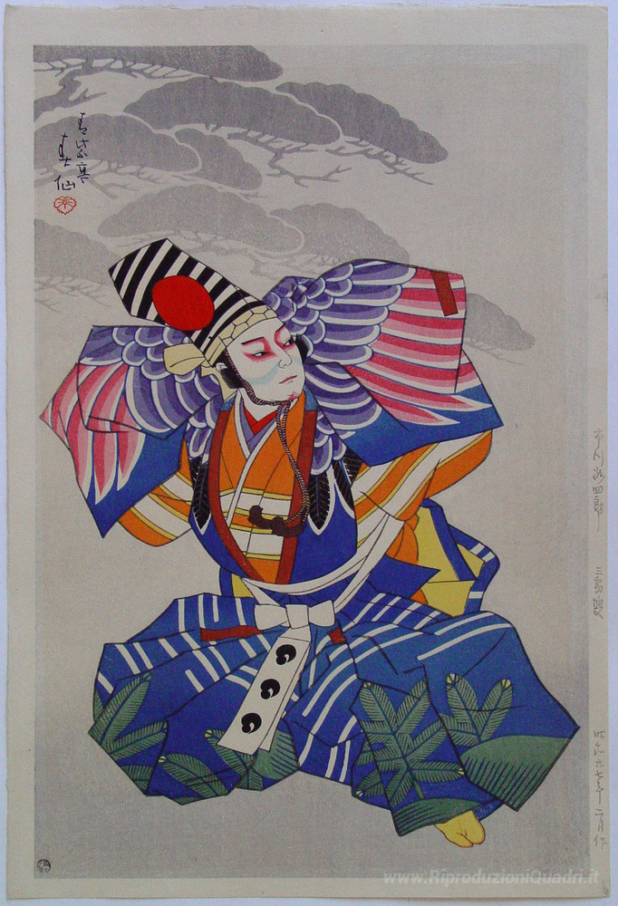 Ti offriamo una riproduzione artigianale su tela dell'opera famosa 'Ichikawa Danshiro come Sanbas? Dancer in blu Kimono' di Natori Shunsen, dal Museo delle Riproduzioni.