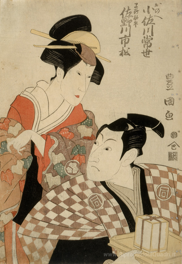 Ti offriamo una riproduzione artigianale su tela dell'opera famosa 'Kabuki Attori Sanogawa Ichimatsu II come Hayano Kampei e Osagawa' di Utagawa Toyokuni, dal Museo delle Riproduzioni.