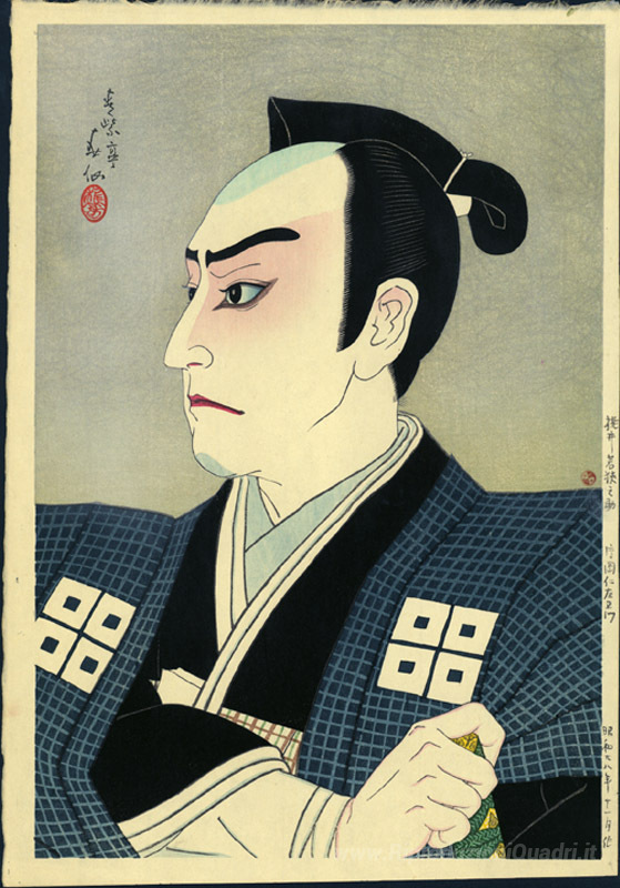 Ti offriamo una riproduzione artigianale su tela dell'opera famosa 'Kitaoka Nizaemon come Wakasanosuke in Chushingura' di Natori Shunsen, dal Museo delle Riproduzioni.
