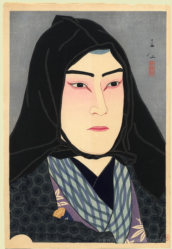 Ti offriamo una riproduzione artigianale su tela dell'opera famosa 'Nakamura Fukusuke nel ruolo di Soshichi, un contrabbandiere' di Natori Shunsen, dal Museo delle Riproduzioni.