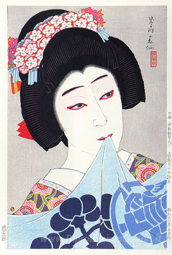 Ti offriamo una riproduzione artigianale su tela dell'opera famosa 'Nakamura Utaemon come Hanako in Musume Dojoji' di Natori Shunsen, dal Museo delle Riproduzioni.