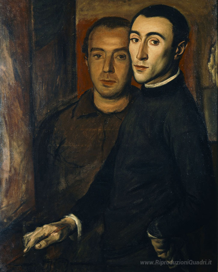 Ti offriamo una riproduzione artigianale su tela dell'opera famosa 'Autoritratto con Nikos Nikolaou' di Yiannis Moralis, dal Museo delle Riproduzioni.