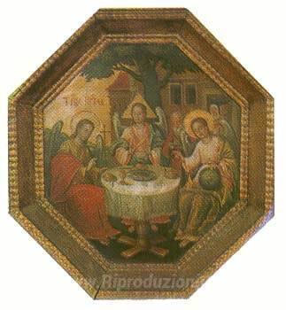 Ti offriamo una riproduzione artigianale su tela dell'opera famosa 'Trinità dell'Antico Testamento' di Yov Kondzelevych, dal Museo delle Riproduzioni.